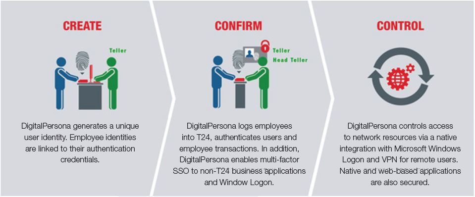DigitalPersona for Temenos provides for a more modern approach to authentication, delivering stronger security and compliance. As a native component of T24, the DigitalPersona for Temenos solution enables the creation of a unique user identity, confirmation (authentication) of that identity and control of what that identity accesses, all seamlessly integrated into the Temenos offering. The solution eliminates the concern over shared credentials, ensuring only